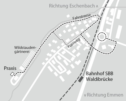 von da zu Fuss in 6 Minuten zur Praxis im hellen Haus.